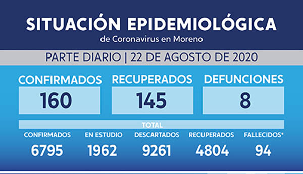 En el municipio de Moreno hay 166 nuevos casos confirmados, 171 nuevas personas recuperadas y una defunción, de la cual se desconoce la asociación al evento de defunción. En total, suman 6961 casos confirmados, 1821 casos sospechosos y 9474 casos descartados.