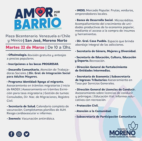 El Programa “Amor por el Barrio” acerca de manera itinerante asesoramiento, acompañamiento y distintos servicios a las vecinas y los vecinos de Moreno. En esta oportunidad, el operativo estará presente el día 22 de marzo en Moreno Norte, en la Plaza Bicentenario, ubicada en la calle Venezuela en Chile y México, de 10 a 13 horas. En caso de lluvias la actividad se suspende.