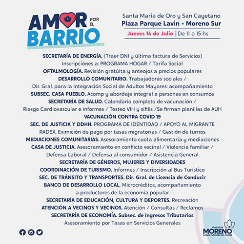 Inscripciones a Programa Hogar y Tarifa Social; llevar última factura de servicios y D.N.I; Oftalmología: revisión gratuita y anteojos a precios populares; Secretaría de Desarrollo Comunitario: atención de trabajadoras sociales, acompañamiento de la Dirección de General para la integración social de Adultos Mayores; Subsecretaria Casa Pueblo: consumos problemáticos; Secretaría de Salud: calendario completo de vacunación, riesgo cardiovascular, testeos de VIH y sífilis, se firman y completan planillas de AUH; Vacunación contra el Covid-19; Secretaría de Justicia y Derechos Humanos: Programa Identidad y Apoyo al Migrante; Mediaciones Comunitarias: asesoramiento en cuota alimentaria y medicaciones; Casas de Justicia: asesoramiento en conflictos vecinales, violencia familiar, defensa laboral y al consumidor. Asistencia en general, RADEX, eximición de pagos tasa migratoria, gestión de turnos; Secretaría de Género, Mujeres y Diversidades; Coordinación de Turismo: informes, inscripción al bus turístico; Secretaría de Tránsito y Transporte: Dirección General de Licencias de Conducir; Banco de Desarrollo Local: Microcréditos, acompañamiento a productores de la economía popular; Secretaría de Educación, Cultura y Deportes: recreación; Atención a Vecinas y Vecinos: atención de consultas y reclamos y la Secretaría de Economía – Subsecretaria de Ingresos Tributarios: asesoramiento por Tasas en Servicios Generales.