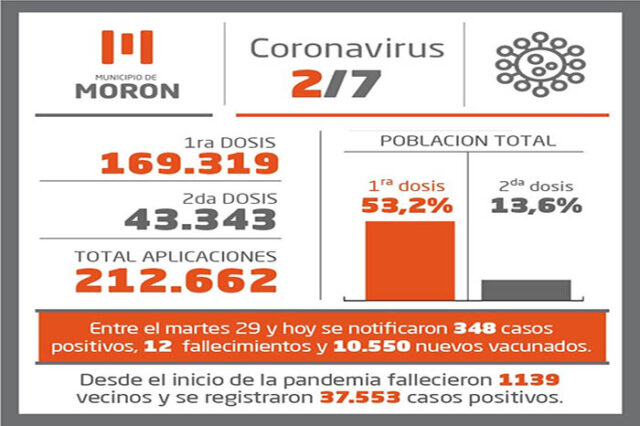 Desde el último martes a la noche se registraron 348 casos positivos de coronavirus entre la población del distrito. Se trata de 201 mujeres y 183 hombres que elevan la cantidad de casos confirmados a 37.553; mientras que las altas médicas sumaron 337 personas y alcanzaron las 34.673 desde el inicio de la pandemia. En los últimos tres días se registraron 12 nuevos fallecimientos, 3 mujeres de 74, 80 y 93 años y 9 varones de 37, 53, 55, 56, 63, 72, 73, 84 y 87 años por lo que actualmente los moronenses que murieron como consecuencia del Covid-19 son 1.139.