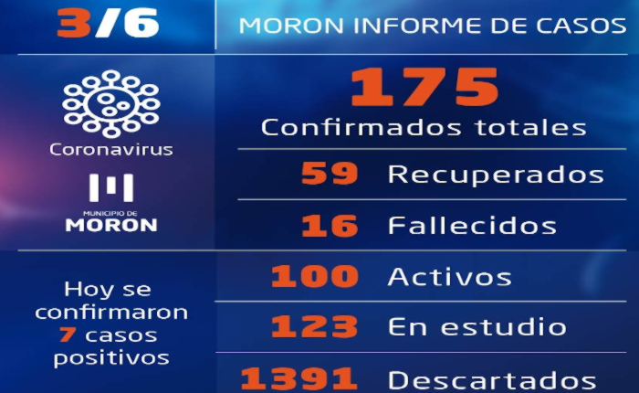El municipio de Morón informa que en el día de hoy se confirmaron 7 casos de Coronavirus, que se suman a los 168 registrados hasta ayer en el distrito. Se trata de cuatro mujeres de 31, 37, 41 y 57 años y tres hombres de 9, 36 y 54 años.