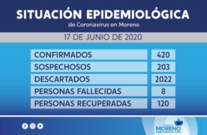 A día de ayer, en el municipio de Moreno se registran 2645 notificaciones de casos, el 76% resultaron negativos y el 15% resultaron positivos. Del total, 420 corresponden a casos confirmados, 203 a casos sospechosos y 2022 a casos descartados. Los decesos por Covid-19 en son ocho.