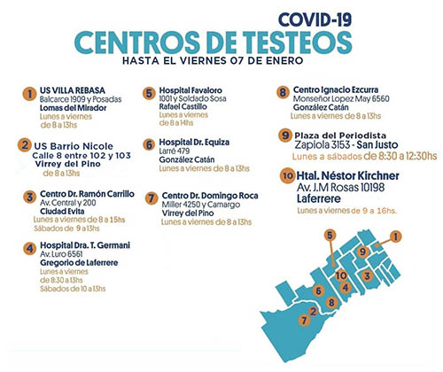 La Secretaría de Salud Pública del Municipio brindó los centros para la realización de hisopados que funcionarán hasta el viernes 7 de enero en distintas localidades del distrito.