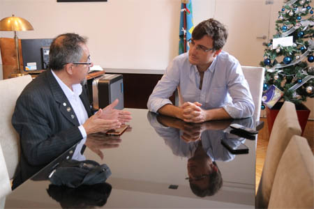 El intendente Lucas Ghi se reunió con Fernando Savore, presidente de la Federación de Almaceneros de la Provincia de Buenos Aires (FABA) y de la Confederación General Almacenera (C.G.A.) para conversar sobre la realidad que atraviesa el sector en el distrito.