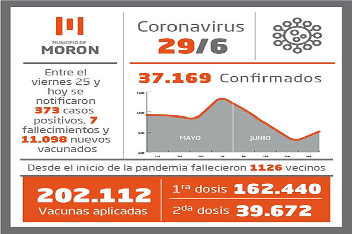Desde la noche del viernes 25 de junio se notificaron 373 casos positivos de coronavirus (183 mujeres y 190 hombres), que llevan el número de confirmados a 37.169 personas desde el inicio de la pandemia. Los recuperados llegaron a 34.336 moronenses. Los decesos ya son 1.126, tras el fallecimiento de 2 hombres de 36 y 50 años y 5 mujeres de 54, 59, 78, 79 y 89 años comunicado hoy en el Sistema Integrado de Información Sanitaria Argentino.