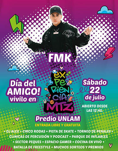 En esta oportunidad, Experiencia MTZ se hará presente en la Universidad de La Matanza (UNLAM) y el sábado 22 de julio, toda la comunidad podrá disfrutar del show de DJ Alex y la presentación especial de “FMK”; el cantante y compositor, representante de la escena urbana actual, se presentará en el escenario principal de “Experiencia MTZ”, que abrirá sus puertas desde las 12 horas.