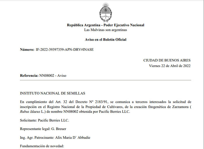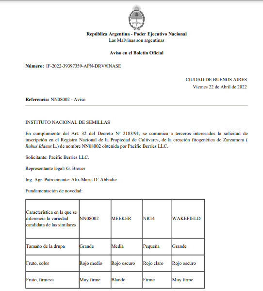 en cumplimiento del Art. 32 del Decreto Nº 2183/91, se comunica a terceros interesados la solicitud de inscripción en el Registro Nacional de la Propiedad de Cultivares, de la creación fitogenética de Zarzamora (Rubus Idaeus L.) de nombre NN08002 obtenida por Pacific Berries LLC.
