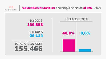 El ritmo de vacunación en Morón avanza intensamente, se aplicó la primera protección al 40,8% de la población local, mientras que el 8,6% ya completó el esquema preventivo con los dos componentes. Así, se alcanzó a inocular a los grupos prioritarios que corresponden a mayores de 60 años, personal de Salud, Educación y Seguridad. En la actualidad, ya se está vacunando a los mayores de 50 años con y sin factores de riesgo.