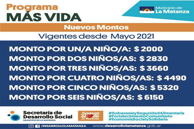 La municipalidad de La Matanza dio a conocer que los titulares de la “Tarjeta Verde” del Programa “Más Vida” recibirán un aumento del 130 % en sus montos, los que se harán efectivos a partir del mes de junio.