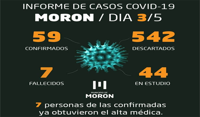 El municipio de Morón informó que en el día de ayer se registraron cinco nuevos casos positivos de coronavirus entre la población del distrito. Son tres vecinos de 36, 41 y 6 años y dos vecinas de 28 y 10 años, que totalizan 59 casos desde el inicio de la pandemia.