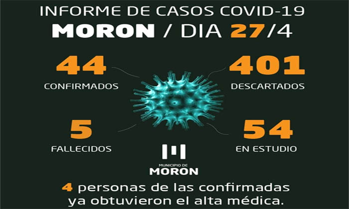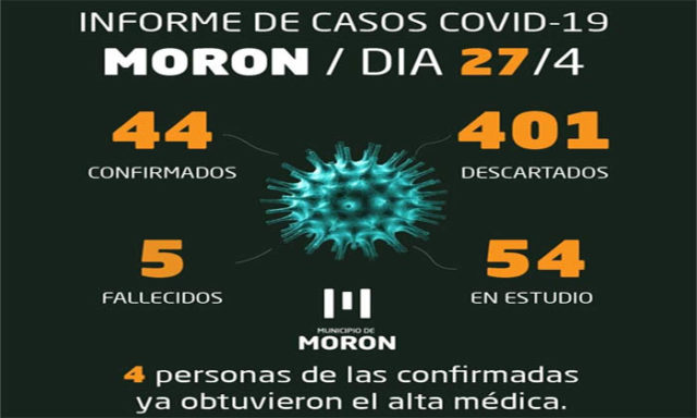 El municipio de Morón informó se registraron tres nuevos casos positivos de coronavirus entre los vecinos y vecinas de la comuna, que elevan el número de confirmados a 44. Se trata de dos hombres de 88 y 77 años y de una mujer de 28.