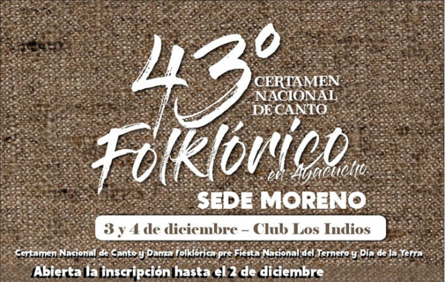 La Municipalidad de Moreno abrió la inscripción al “43° Certamen Nacional de Canto y Danza folklórica pre Fiesta Nacional del Ternero y Día de la Yerra – Pre Ayacucho, Sede Moreno” que se realizará los días 3 y 4 de diciembre en el Club Los Indios.