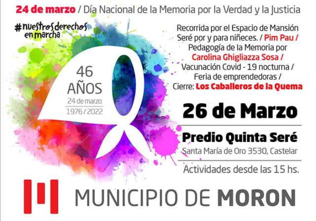 El Municipio de Morón realizará una jornada de Memoria en el Predio Quinta Seré — Polideportivo Gorki Grana, a 46 años del último Golpe de Estado. Habrá actividades culturales durante todo el día y finalizará con la presentación de los Caballeros de la Quema.