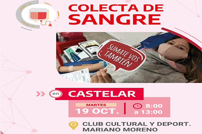 El próximo martes 19 de octubre se realizará una colecta de sangre en el Club Mariano Moreno, ubicado en Cardozo 3080, en Castelar norte. La actividad se realizará de 8 a 13hs y se podrá sacar turno por Whatsapp al 15-4023-3387.