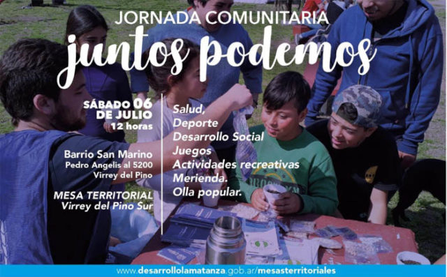 La jornada comunitaria denominada “Juntos Podemos se desarrollará desde las 12 Hs., en la calle Pedro Angelis al 5200 del Barrio San Marino. La misma tendrá espacios de vacunación a cargo de la Secretaría de Salud de la municipalidad de La Matanza, un espacio deportivo con inflables y juegos que brindará la Secretaría de Deportes, espacios recreativos a cargo de la sede Envión-Podes “El aguante” del Barrio San Pedro, junto con organizaciones locales destinado a los más chicos y adolescentes. Además, habrá música en vivo y asesoramiento sobre las Áreas que integran la Secretaría de Desarrollo Social.