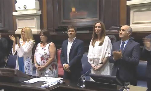 Axel Kicillof asumió, este miércoles, como el flamante Gobernador bonaerense ante la Asamblea Legislativa que sesionó en la Cámara de Diputados provincial, en la que también juró la saliente intendenta de La Matanza, Verónica Magario, como vicegobernadora. El peso político de la Provincia en el nuevo armado político quedó ratificado por la presencia del Presidente y la vicepresidenta, Alberto y Cristina Fernández, en la ceremonia provincial.