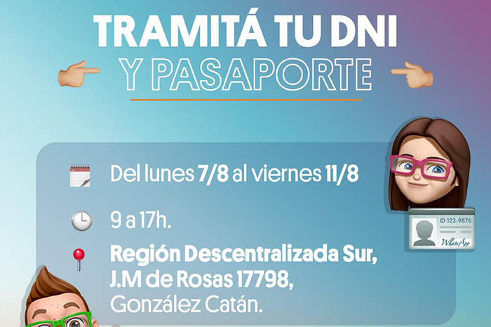 El móvil del RENAPER, estará ubicado, de 9 a 17 horas, en la Región Descentralizada Sur, Juan Manuel de Rosas 17.798, González Catán, realizando toma de datos y el sábado 12 de agosto se podrán retirar los documentos en ese mismo lugar.