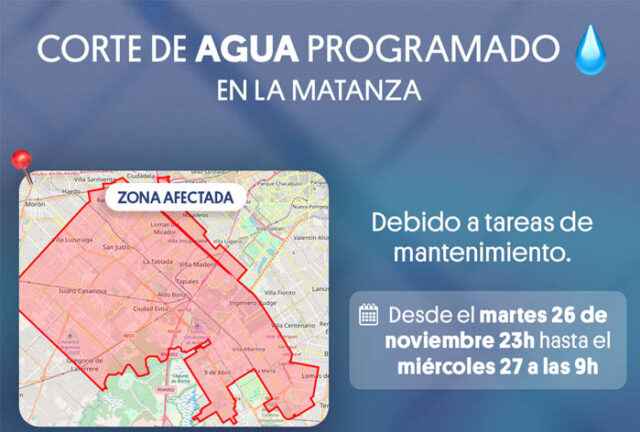 El Municipio de La Matanza dio a conocer que, por razones operativas, la empresa AySA interrumpirá el suministro de agua desde este martes 26 de noviembre a las 23 horas, hasta el miércoles 27 de noviembre a las 9 horas.
