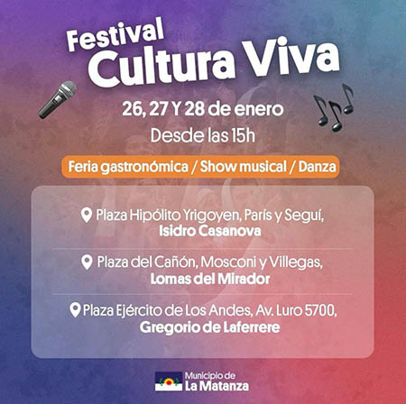 El Municipio de La Matanza continúa con el Festival “Cultura Viva”, un evento donde confluyen la música, el arte y la gastronomía, con el objetivo de brindarles a las familias del distrito durante los meses de verano, un espacio de encuentro y entretenimiento de forma libre y gratuita.