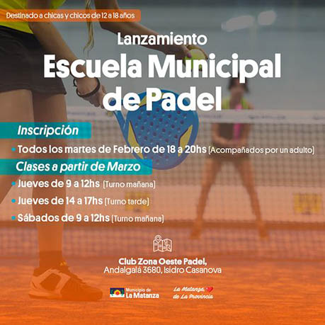 La Municipalidad de La Matanza dio a conocer el lanzamiento de la Escuela Municipal de Padel, destinada a chicos y chicas de 12 a 18 años. Para inscribirse, los interesados deben acercarse todos los martes de febrero de 18 a 20 hs. al Club Zona Oeste Padel, Andalgalá 3680 de Isidro Casanova. La actividad es totalmente gratuita.
