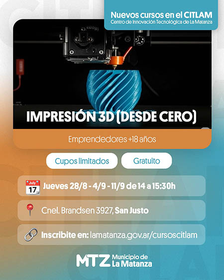 El Municipio de La Matanza anunció la apertura de la inscripción para un nuevo curso gratuito de Impresión 3D – [Desde cero], dirigido a vecinos y emprendedores mayores de 18 años interesados en adquirir habilidades tecnológicas.