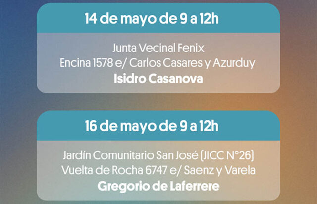 Esta semana, las jornadas se realizarán en dos localidades. El miércoles 14 de mayo, el operativo estará presente en la Junta Vecinal Fénix (Encina 1578, entre Carlos Casares y Azurduy, Isidro Casanova), y el viernes 16 en el Jardín Comunitario San José (Vuelta de Rocha 6747, entre Sáenz y Varela, Gregorio de Laferrere). En ambos casos, el horario será de 9 a 12 horas.