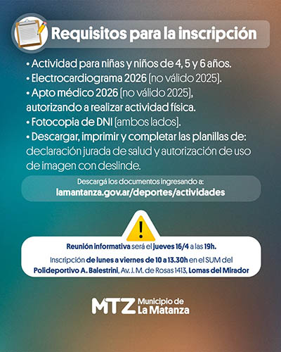 Para completar la inscripción, se deberá presentar documentación obligatoria de lunes a viernes, de 10 a 13:30 horas, en el SUM del establecimiento. Entre los requisitos se incluyen electrocardiograma y apto médico actualizados al 2026, autorización para realizar actividad física, declaración jurada de salud con autorización de uso de imagen, y fotocopia del DNI.