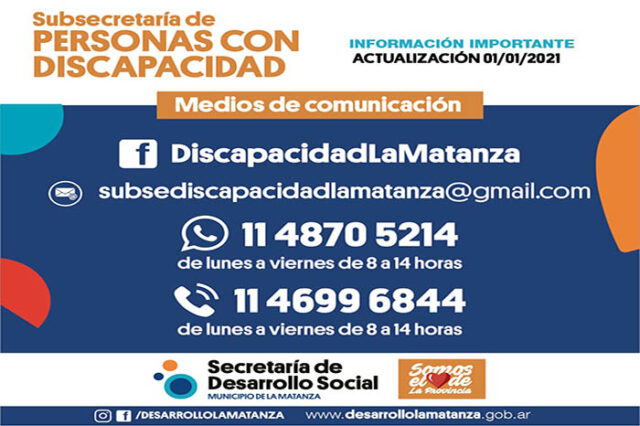 La Subsecretaría de Personas con Discapacidad de La Matanza, que depende de la Secretaría de Desarrollo Social Local, actualiza sus números de teléfono y medios de contacto para asesoramientos, orientación y consultas.