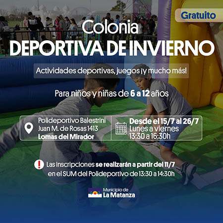 A partir del lunes 15 de julio al viernes 26 de julio, se llevará a cabo la Colonia de Invierno en el Polideportivo Alberto Balestrini, que se encuentra ubicado en Juan Manuel de Rosas 1413, Lomas del Mirador. La colonia funcionará de 13.30 a 16.30 horas. Los cupos son limitados.