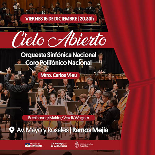 El evento se llevará a cabo el próximo viernes 16 de diciembre, a las 20.30 horas, en Avenida de Mayo y Rosales, Ramos Mejía. Y contará con la actuación de la prestigiosa Orquesta Sinfónica Nacional y el reconocido Coro Polifónico Nacional, bajo la dirección del Maestro Carlos Vieu.