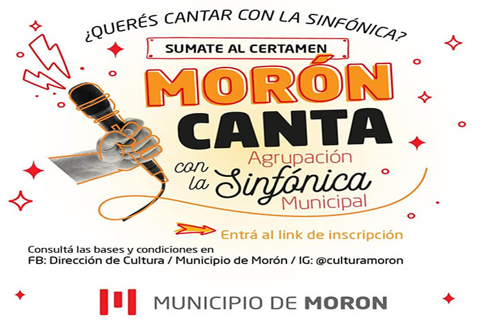 El municipio de Morón abrió una convocatoria para que los vecinos y vecinas mayores de 16 años puedan participar de “Morón Canta”. Un certamen de canto vocacional organizado por la Dirección de Cultura del Municipio junto a la Agrupación Sinfónica Municipal, dirigida por el Maestro Gustavo Codina.