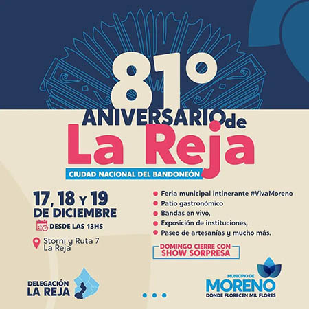 La municipalidad de Moreno realizará una serie de actividades para festejar el 81° Aniversario de la Reja, Ciudad Nacional del Bandoneón el 17, 18 y 19 de diciembre, desde las 13 horas, en la calle Storni y la Ruta 7.