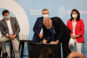 El convenio tuvo lugar en el marco de un acto encabezado por el Presidente Alberto Fernández en el Centro Cultural “La Chicharra” de Cuartel V, en Moreno, donde brindó un reconocimiento a trabajadores y trabajadoras sociocomunitarias, que cumplieron un rol clave frente a la pandemia en comedores, merenderos, jardines y postas sanitarias.