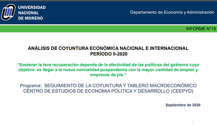 La Universidad Nacional de Moreno (UNM) dio a conocer que se encuentra disponible para su consulta el Informe Nº 19 de Análisis de la Coyuntura Económica Nacional e Internacional, correspondiente al período I del año 2020.