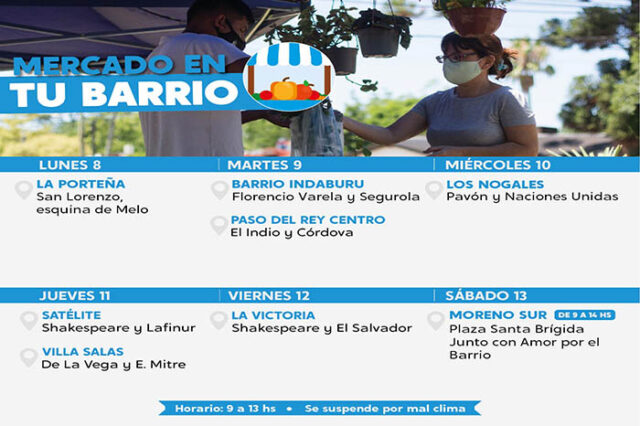 El Programa «Mercado en tu barrio», se realiza todas las semanas en diferentes puntos del municipio de Moreno -en modalidad itinerante- para que todos puedan acceder a una vasta variedad de víveres entre los que se encuentran: frutas y verduras; pastas y lácteos; huevos de campo; aceite; miel; legumbres; panificados; productos de limpieza y floricultores, aprecios accesibles.