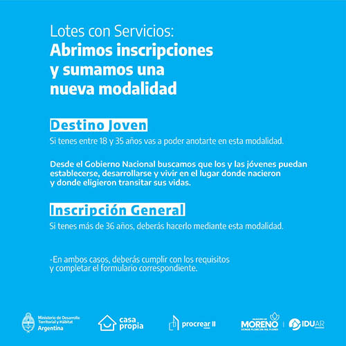 las personas de entre 18 y 35 años, deberán anotarse en la modalidad Destino Joven, orientada a las y los jóvenes, y personas mayores a 36 años podrán anotarse en la modalidad de Inscripción General. Ambas modalidades están orientadas a posibilitar el acceso al crédito hipotecario para la compra del lote.