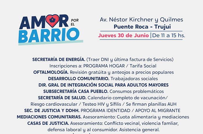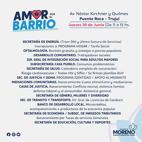 El Programa “Amor por el Barrio” acerca de manera itinerante asesoramiento, acompañamiento y distintos servicios a las vecinas y los vecinos de Moreno. En esta oportunidad, el operativo estará presente este jueves 30 de junio, en Puente Roca, ubicado en la Avenida Néstor Kirchner y Quilmes, en Trujui, de 10 a 14 horas. En caso de lluvias la actividad se suspende.