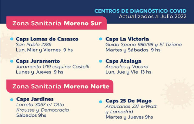 El Municipio de Moreno actualizó los Centros de Diagnóstico Covid-19 al mes de julio de 2022. Debido a que con la llegada del invierno, las bajas temperaturas, la poca ventilación delos ambientes y la alta circulación de virus respiratorios se pueden contraer enfermedades.