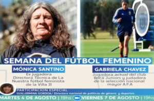 En el marco de la Semana del fútbol femenino, disertarán por Zoom los días martes 4 y viernes 7 de agosto a las 19 horas: la ex-jugadora y Directora Técnica de La Nuestra fútbol feminista de la Villa 31 Mónica Santino, y la actual jugadora del club Boca Junior y de la Selección Nacional Mayor de la Asociación de Fútbol Argentina (AFA) Gabriela Chávez; quienes contarán sus experiencias, sus logros personales y profesionales.