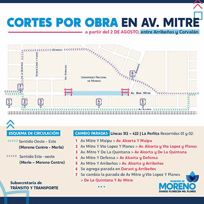 El tráfico proveniente de Av. Mitre desde Paso del Rey hacia Moreno Centro debe girar a la derecha por calle España o Nemesio Álvarez (según etapa del corte) y continuar por calle Tucumán.