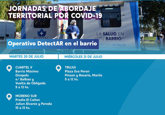 – Martes, 20 de Julio – Cuartel V – Barrio Máximo, en la calle Discépolo entre Balbao y Vuelta de Obligado, de 9 a 12 horas – Moreno Sur – en el predio “El Cañón”, en las calles Julián Álvarez y Pereda, de 10 a 13 horas.