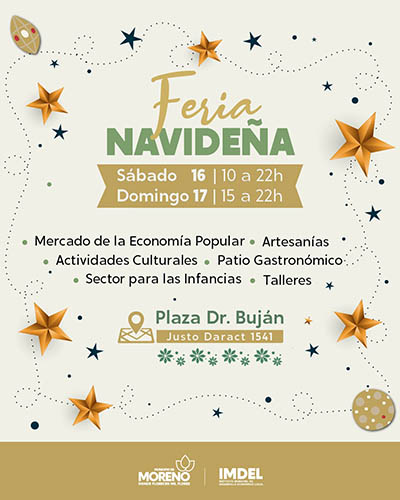 En el marco de las celebraciones de Navidad y año nuevo, el Municipio de Moreno, a través del Instituto Municipal de Desarrollo Económico Local (IMDEL), realizará una nueva edición del “Mercado Navideño” el sábado 16, de 10 a 20 horas; y el domingo 17, de 15 a 22 horas, en la plaza Buján.