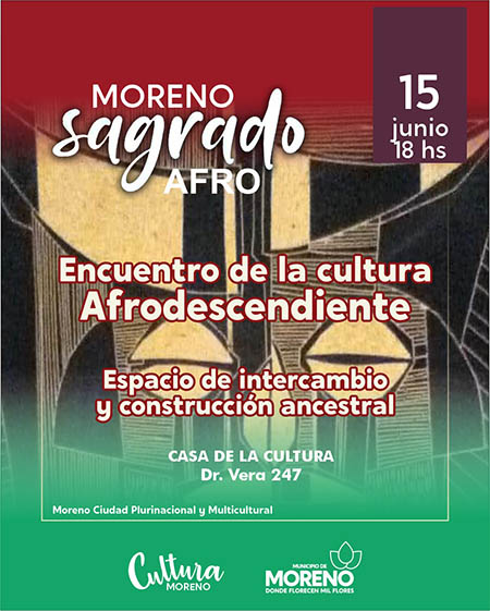 En el marco del ciclo Moreno Sagrado, el Municipio de Moreno a través de la Subsecretaría de Cultura, realizará el “Encuentro de la Cultura Afrodescendiente”. Dicha iniciativa se desarrollará el jueves 15 de junio, a las 18 horas en la Casa de la Cultura, ubicada en Doctor Vera 247, Moreno Centro.