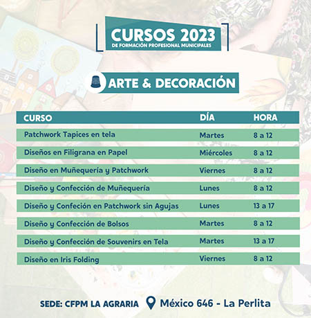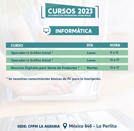 La inscripción a los cursos se realiza únicamente de manera presencial, y se dictarán la Escuela de Formación Técnico Laboral, ubicada en la calle Merlo 2091 y en “La Agraria”, que se encuentra en la calle México 646, desde el día miércoles 23 de agosto hasta el viernes 25 de agosto, 8 a 13 horas.