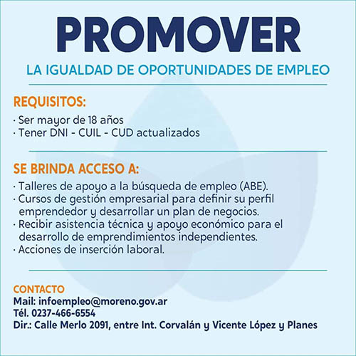 A través del programa “Promover la Igualdad de Oportunidades de Empleo”, el Municipio de Moreno ofrece acompañamiento para acceder a actividades que permiten mejorar competencias, y habilidades, la inserción en empleos de calidad y el desarrollo de emprendimientos.