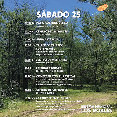 El sábado 25, de 10 a 19 horas, se podrá disfrutar del patio gastronómico; y a partir de las 12 horas, estará disponible la feria artesanal. En tanto a las 11, como a las 14.30 y las 17 horas, se realizará la recorrida guiada por el Centro de Visitantes. A las 13 horas, en el sector de la biblioteca Padoani, se brindará un taller de talado sustentable a cargo de Esteban Tello.