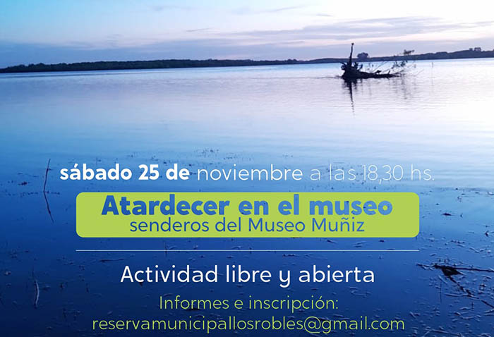 También, a las 18.30 horas se podrá participar de la actividad libre y abierta “Atardecer en el Museo – senderos del Museo Muñiz”, para toda la familia. Informes e inscripción previa por e-mail: [email protected]. La misma es con cupos limitados y se suspende por lluvia.