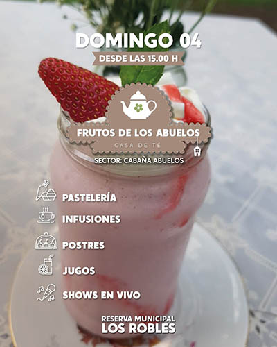 A las 12 horas se desarrollará en la cabaña “Los Abuelos” la actividad Casa de Té «Frutos de los Abuelos», donde se podrá degustar de sanguches y meriendas refrescantes. Y, a las 16 horas se realizará la “Caminata guiada por los senderos del bosque”.