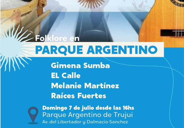 Asimismo, el domingo, a partir de las 16 horas, se desarrollará la actividad Folklore en el Parque Argentino de Trujui, ubicado en Av. del Libertador y Dalmacio Sánchez. Habrá shows de música en vivo con la presentación de los artistas: Gimena Sumba, El Calle, Melanie Martínez y Raíces Fuertes. De entrada libre y gratuita.
