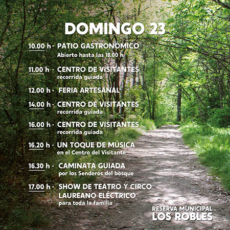 A las 15 horas se desarrollará en el sector de la biblioteca la actividad, Cuentos de la Tierra. Mientras que a las 16.30 horas se podrá participar de la actividad “Caminata guiada por los senderos del bosque”. A las 17 horas, se podrá disfrutar en la proveeduría de un show musical acústico en vivo con la presencia de Matías de los Santos.